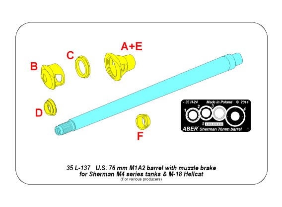 U.S 76 mm M1A2 barrel with muzzle brake for Sherman M4 series tanks with M62 mount